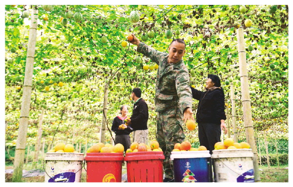 在三门镇大地村,村民在采摘吊瓜。潘志祥 摄
