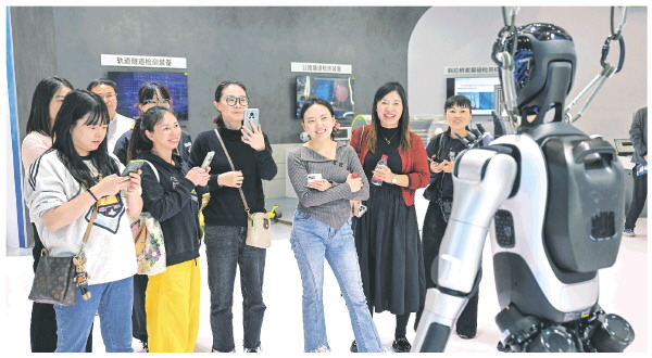 10月28日,在重庆悦来国际博览中心,观众在2025年世界城市日中国主场活动主题展览区参观智能安防机器人。