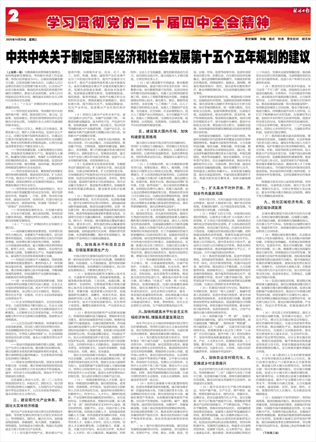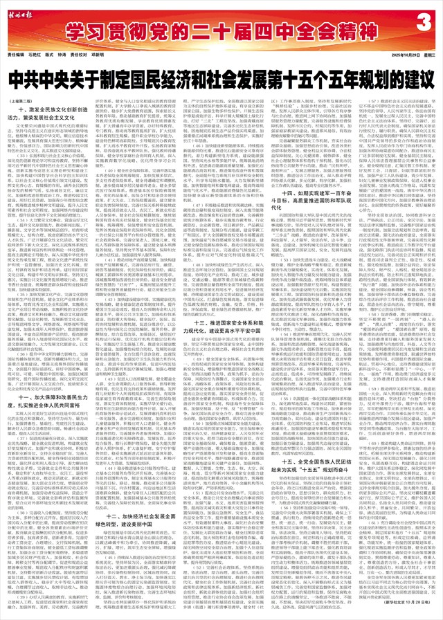 和社会发展第十五个五年规划的建议 (二〇二五年十月二十三日中国共产党第二十届中央委员会第四次全体会议通过)   中国共产党第二十届中央委员会第四次全体会议深入分析国际国内形势,就制定国民经济和社会发展“十五五”规划提出以下建议。