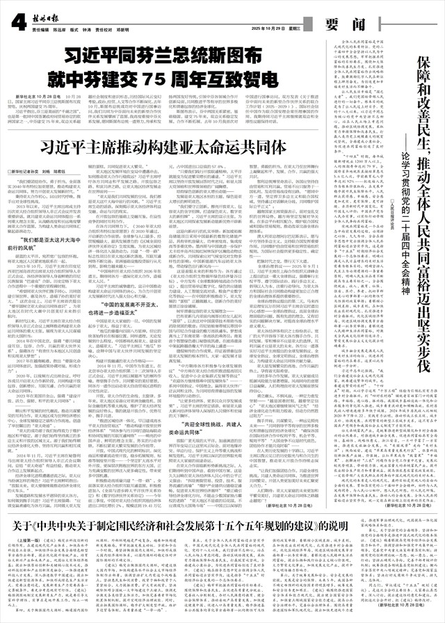 第三,关于以推动高质量发展为主题。《建议》与“十四五”规划一脉相承,继续把推动高质量发展确定为“十五五”时期经济社会发展的主题,要求坚持以经济建设为中心,完整准确全面贯彻新发展理念,实现质的有效提升和量的合理增长,推动经济持续健康发展和社会全面进步。推动高质量发展,最重要是加快高水平科技自立自强,积极发展新质生产力,在推动科技创新、加快培育新动能、促进经济结构优化升级上取得实质性、突破性进展。(下转第四版)