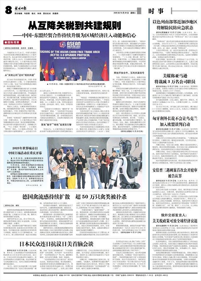 当地时间10月28日,中国与东盟在马来西亚首都吉隆坡签署自贸区3.0版升级议定书,标志着中国与东盟经贸合作水平再次升级。分析人士认为,在全球经济面临诸多不确定性之际,3.0版升级议定书的签署是中国与东盟共同推动高质量开放合作的重要举措,展现了区域国家携手应对全球经济挑战的决心,为区域经济发展注入新动能和信心。