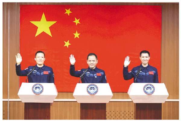 10月30日,神舟二十一号载人飞行任务航天员张陆(中)、武飞(右)、张洪章在酒泉卫星发射中心问天阁与媒体记者集体见面。 新华社发(汪江波 摄)