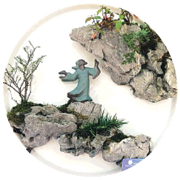 吸引眼球的还有挂壁盆景。挂壁盆景是一种类似于浮雕、木刻和壁画的盆景新形式,将传统的盆景艺术同贝雕、树皮画等工艺美术品制作技艺和形式巧妙结合,还吸收了国画、书法艺术的精华。它用长方形的大理石板或轻质金属薄板等作为背景挂于墙壁上,在其上粘贴山石,栽种植物,不占用桌面和地面空间,形式新颖,装饰美化居室效果极佳。