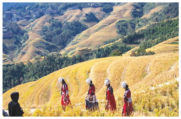 11月1日,几位来自桂林的游客在广西龙胜各族自治县龙脊梯田开心旅拍,在即将收割的稻浪间留下倩影,抓住金秋的尾巴。近年来,为最大限度保障梯田的黄“金”赏美期,最大程度满足海内外游客的“眼福”,金坑·大寨梯田收割时间推迟至11月2日。梯田的“黄金”期足足延长半个月,为游客错峰旅游“打卡”这世界奇观留下宝贵“续期”。最近两年多来,农行龙胜县支行累计发放民宿贷、乡旅贷、惠农e贷等贷款2.06亿元,支持当地修建旅游道路,帮助村民建民宿、升级农家乐等,还在当地布置了28个新型惠农通服务点,其中多个可以使用外卡、兑换外币等,方便境内外游客提升旅游体验,受到各方好评。