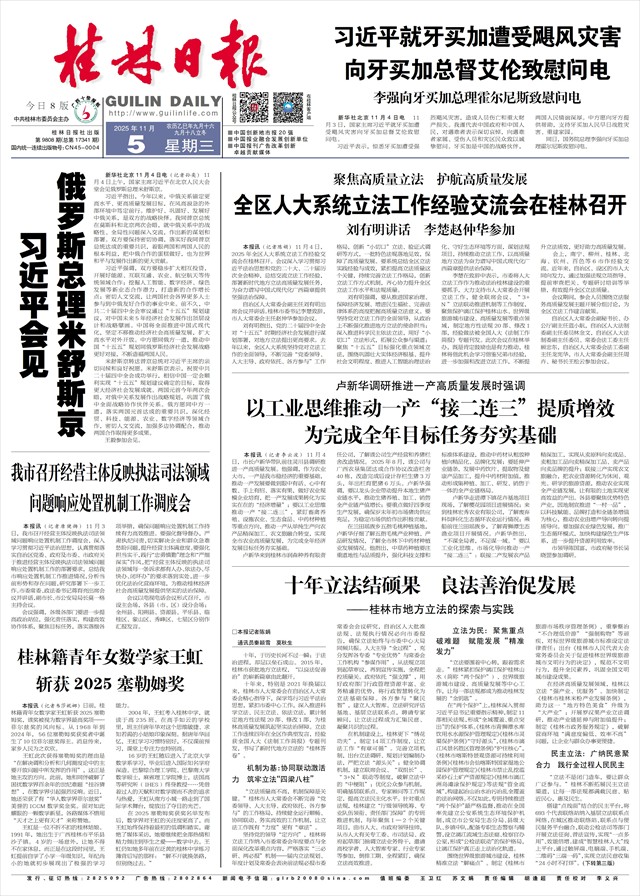 聚焦高质量立法 护航高质量发展 全区人大系统立法工作经验交流会在桂林召开 刘有明讲话 李楚赵仲华参加   本报讯(记者陈娟)11月4日,2025年全区人大系统立法工作经验交流会在桂林召开。会议深入学习贯彻习近平法治思想和党的二十大、二十届历次全会精神,总结交流立法工作经验,部署新时代地方立法高质量发展任务,为奋力谱写中国式现代化广西篇章提供坚强法治保障。