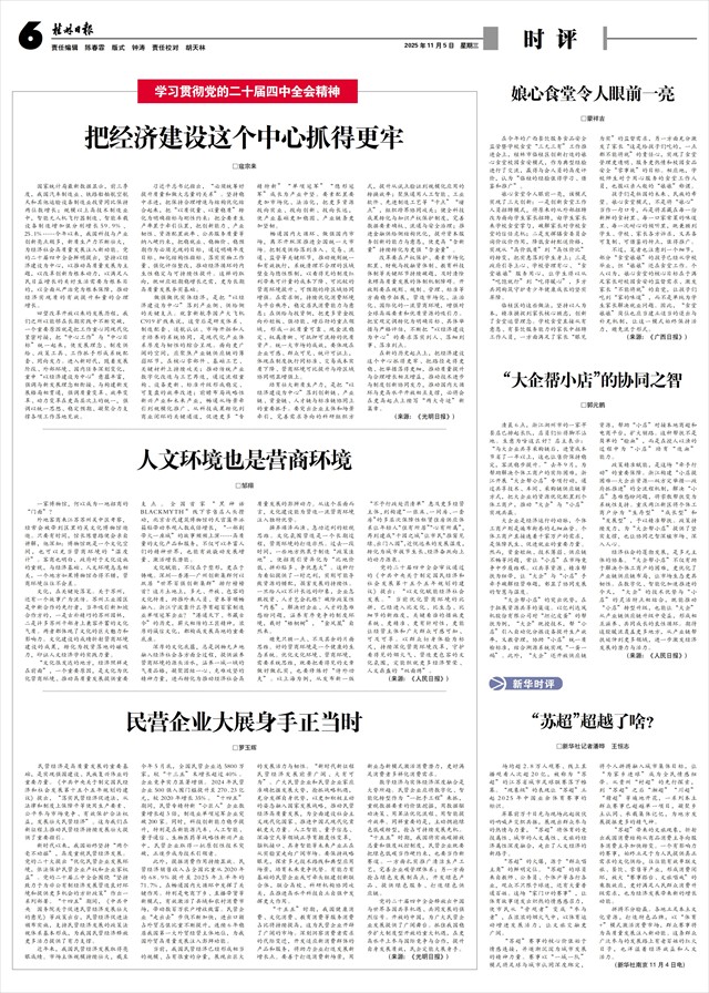 党的二十届四中全会审议通过的《中共中央关于制定国民经济和社会发展第十五个五年规划的建议》提出:“以文化赋能经济社会发展。”当前优化营商环境的比拼,已经进入比文化、比生态、比细节的新维度,关键看谁的措施更系统、更精准、更有针对性,更能让经营主体和广大群众可感可知、可及可享。以群众切身体验为标尺,持续深化营商环境改革,守护看得见的烟火气、营造更包容的文化氛围,定能织就更多经济繁荣、人文鼎盛的“双面绣”。