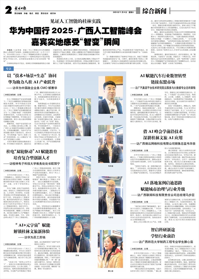 峰会在桂林召开 柴天佑赵仲华刘超出席活动   本报讯(记者李云波)11月7日,以“数智世界 八桂有为”为主题的华为中国行2025·广西人工智能峰会在桂林成功举办。此次峰会聚焦人工智能赋能千行百业,共同探讨数智时代创新突破新趋势,助力AI创新和产业融合,奋力谱写人工智能赋能广西高质量发展新篇章。中国工程院院士柴天佑,桂林市人大常委会主任赵仲华,华为公司副总裁、制造与大企业军团CEO刘超等出席活动。