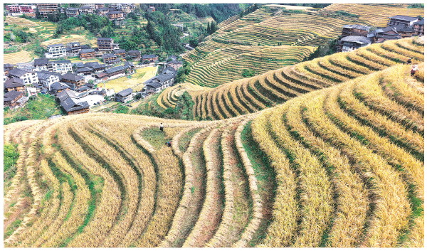 ◤近日,龙胜各族自治县龙脊镇大寨村种植的水稻进入收获季节。村民抢抓晴好天气,收割、脱粒、搬运,梯田上呈现一派忙碌的景象,处处洋溢着丰收的喜悦。