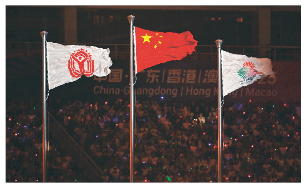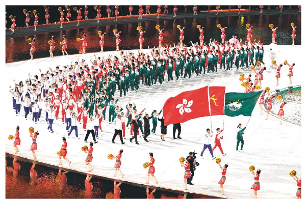 11月9日,广东省体育代表团、香港特别行政区体育代表团、澳门特别行政区体育代表团在入场仪式上共同入场。 新华社记者胡虎虎 摄