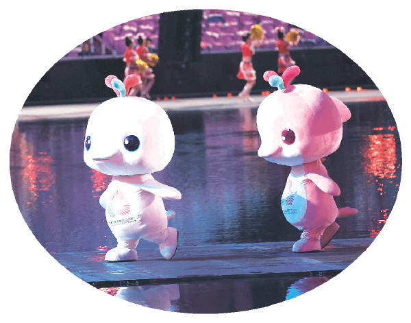 11月9日,第十五届全国运动会吉祥物“喜洋洋”和“乐融融”在开幕式现场表演。 新华社记者雒圆 摄