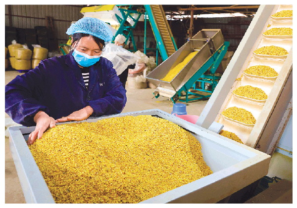 连日来,阳朔县白沙镇桂花集市和镇上的上百家桂花加工企业一派繁忙的景象,人们忙着收购、加工新鲜的桂花。近年来,随着加工工艺、设备的不断升级,白沙镇的桂花加工企业纷纷采用真空微波烘干和冷冻干燥技术加工桂花,既保持了桂花原有色泽和香气,又提升了口感。如今,全镇已逐渐形成一条较为完整的桂花产业链,成为白沙镇农业经济稳定发展增长点。