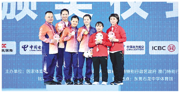 11月10日,冠军广西队选手赵金兰(左四)、亚军广西队选手赵金红(左三)和季军陕西队选手陈雅柔(右二)在颁奖仪式上合影。新华社记者杨晨光 摄