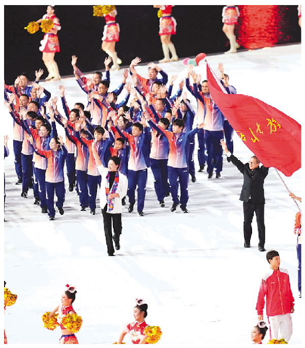 广西云-广西日报讯(记者玉智威 金翔义)11月9日晚,在广东奥林匹克体育中心体育场,播音员以激昂的语调宣布:现在进场的是广西壮族自治区代表团。这时全场响起了如潮的掌声,伴随着“山歌好比春江水”乐曲,广西体育代表团昂首阔步迈进开幕式现场。