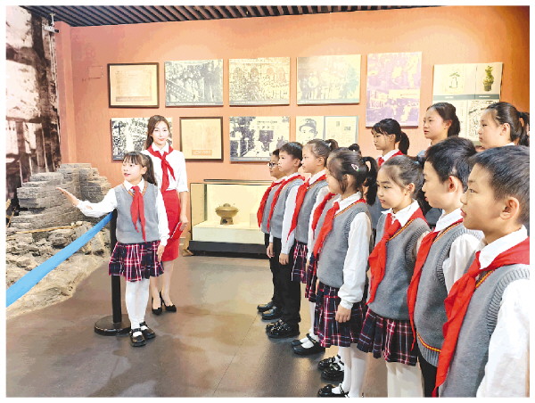 佩戴着红领巾的小讲解员站在展陈前,向同伴们动情地叙述着。