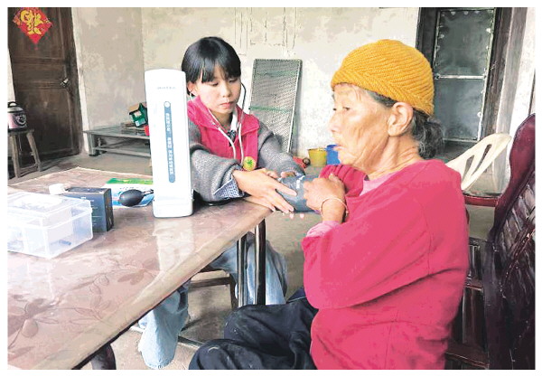 ▲灌阳县水车镇东流村村医熊媛媛进村入户随访为老年人测量血压