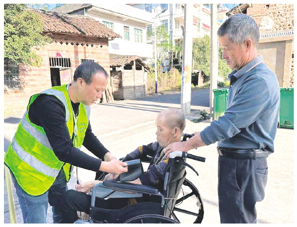 ▲全州县才湾镇七星村村医秦旭临为行动不便的村民提供上门健康监测服务