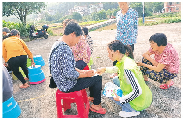 ▲阳朔县高田镇古登村村医廖冬雪利用村民集中的时候“插空”宣传卫生健康知识