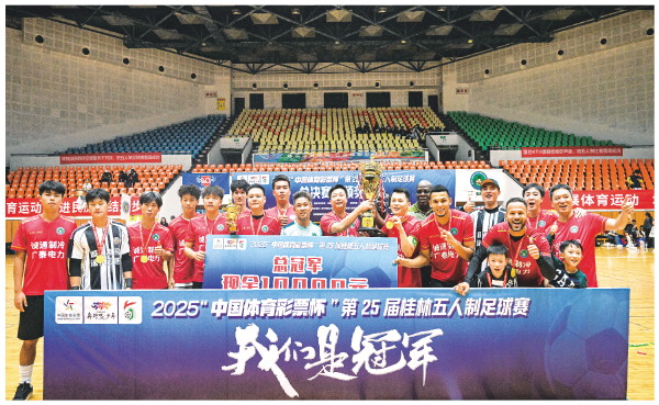 本报讯(记者刘菁 李思静)11月15日晚,桂林五人制足球赛总决赛在市中心广场体育馆举行。最终,阳朔漓水云庭民宿·广泰电力·诚通制冷·国会一队(下皆简称“国会一队”)凭借下半场的战术调整与三位外援“顶配”阵容的惊艳发挥,以4∶0战胜漓泉啤酒,捧起总冠军奖杯。至此,2025“中国体育彩票杯”第25届桂林五人制足球赛落下帷幕。
