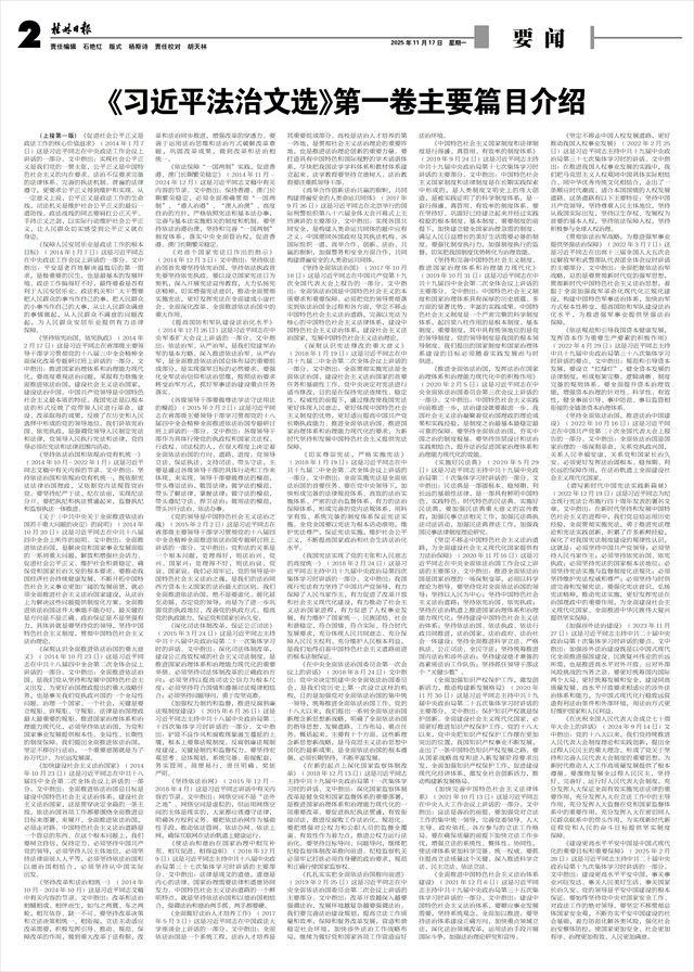 第一卷主要篇目介绍   新华社北京11月16日电  中共中央党史和文献研究院编辑的《习近平法治文选》第一卷,收入习近平同志2012年12月至2025年2月期间关于法治建设最重要、最基本的著作,共有报告、讲话、演讲、指示、批示等69篇。部分著作是第一次公开发表。现将《习近平法治文选》第一卷主要篇目介绍如下。