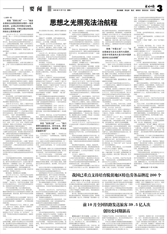 擎真理之旗,掌时代之舵。习近平法治思想的磅礴伟力,推动新时代法治实践阔步前行,为续写经济快速发展和社会长期稳定两大奇迹新篇章奠定坚实基础,在迈向中国式现代化的时代征程中不断创造法治中国新的辉煌。(下转第三版)
