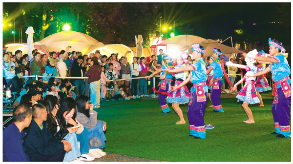 11月15日晚,桂林旅投集团举办的2025桂林马拉松“致敬每一步坚持”专场音乐晚会在象山景区爱情岛漓·象音乐广场举行。图为晚会现场,舞者为市民游客奉献了一场极具民族特色的艺术享受。