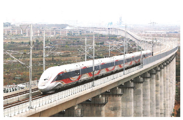 11月17日,一列试验动车组通过西延高铁富平特大桥(无人机照片)。
