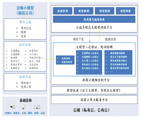 该项目依托“边缘小模型+中心大模型”的融合技术架构,构建了一套全流程智能化运营体系。边缘小模型主要对人、车、道路环境等全要素进行精准感知,实现单帧图像<100ms的实时分析能力,支持多视频流并行处理;中心大模型通过注意力机制显著提升抗干扰性能和识别精度,形成“数据采集-事件检测-反馈优化-模型迭代”的完整数据闭环。目前,该系统已覆盖12类高速公路核心业务场景,事件识别准确率高达95.67%,应急响应时间压缩至15秒内,人工监控时长减少90%。同时,融合多年来建立的警路企联勤联动机制和“一路多方”共建共管安全运行模式,为跨境高速公路智能运营提供了坚实技术和机制支撑,助力构建智能高效、安全可靠的区域交通体系。