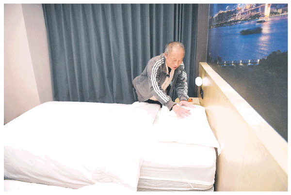 ▲11月28日,宏福苑居民邝佩麟在粤海酒店“爱心客房”里整理床铺。