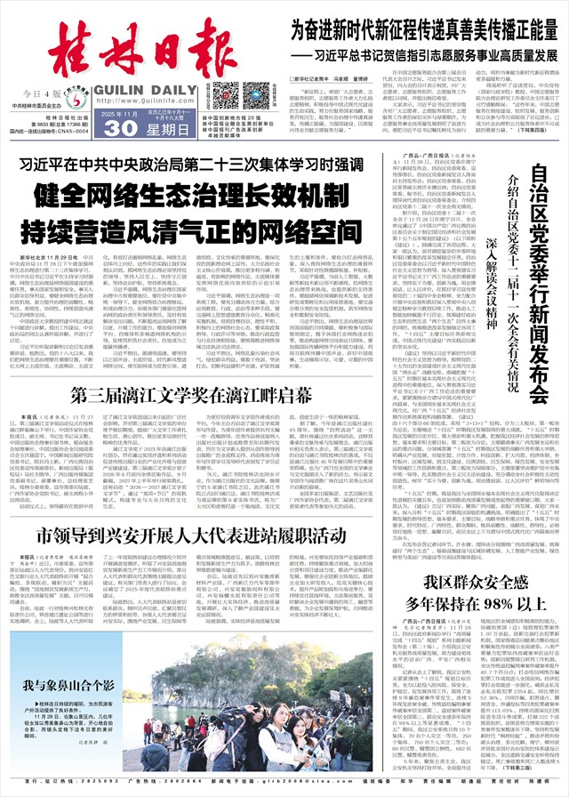 据介绍,自治区党委十二届十一次全会于11月28日在南宁召开,全会审议通过了《中国共产党广西壮族自治区委员会关于制定国民经济和社会发展第十五个五年规划的建议》(以下简称《建议》),圆满完成了各项议程。大家一致认为,面对错综复杂的外部环境和艰巨繁重的改革发展稳定任务,自治区党委常委会以习近平新时代中国特色社会主义思想为指导,深入贯彻落实习近平总书记关于广西工作论述的重要要求,坚持实干为要、创新为魂,用业绩说话、让人民评价,在抓好学习宣传贯彻党的二十届四中全会精神、全力配合开展中央巡视和抓好深入贯彻中央八项规定精神学习教育后续工作、推动人工智能加快赋能千行百业、统筹建好政治生态和自然生态“两个生态”四件大事的同时,统筹推进改革发展稳定各项工作,“十四五”主要目标任务即将完成,中国式现代化建设广西实践迈出新的坚实步伐。