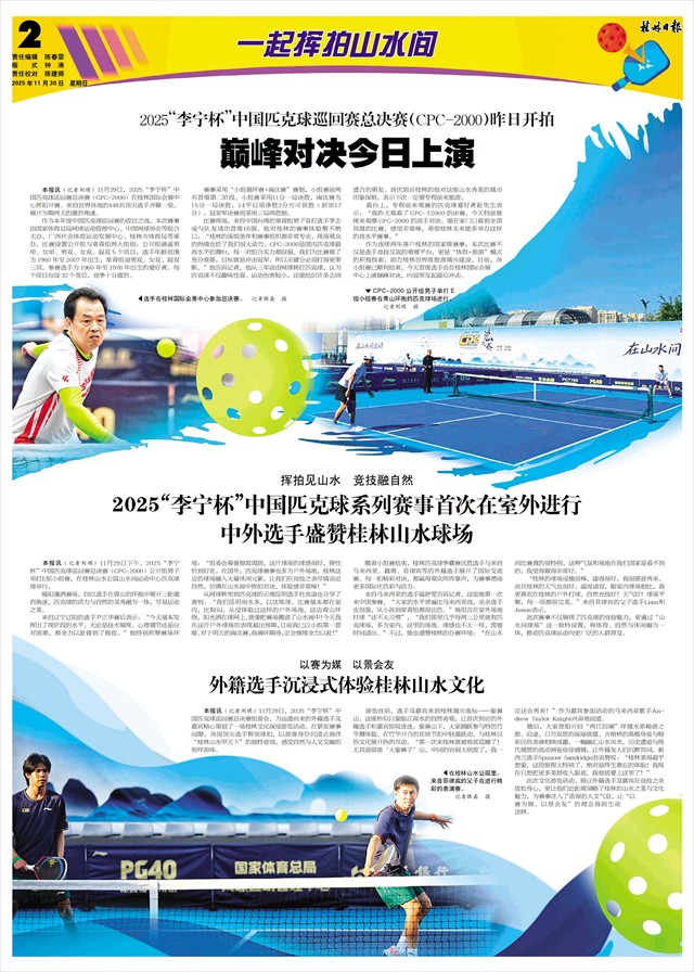 本报讯(记者刘琪)11月29日,2025“李宁杯”中国匹克球巡回赛总决赛组委会,为远道而来的外籍选手及嘉宾精心策划了一场桂林文化深度游览活动。在紧张赛事间隙,各国顶尖选手暂别球拍,以游客身份沉浸式徜徉“桂林山水甲天下”的独特意境,感受自然与人文交融的别样韵味。