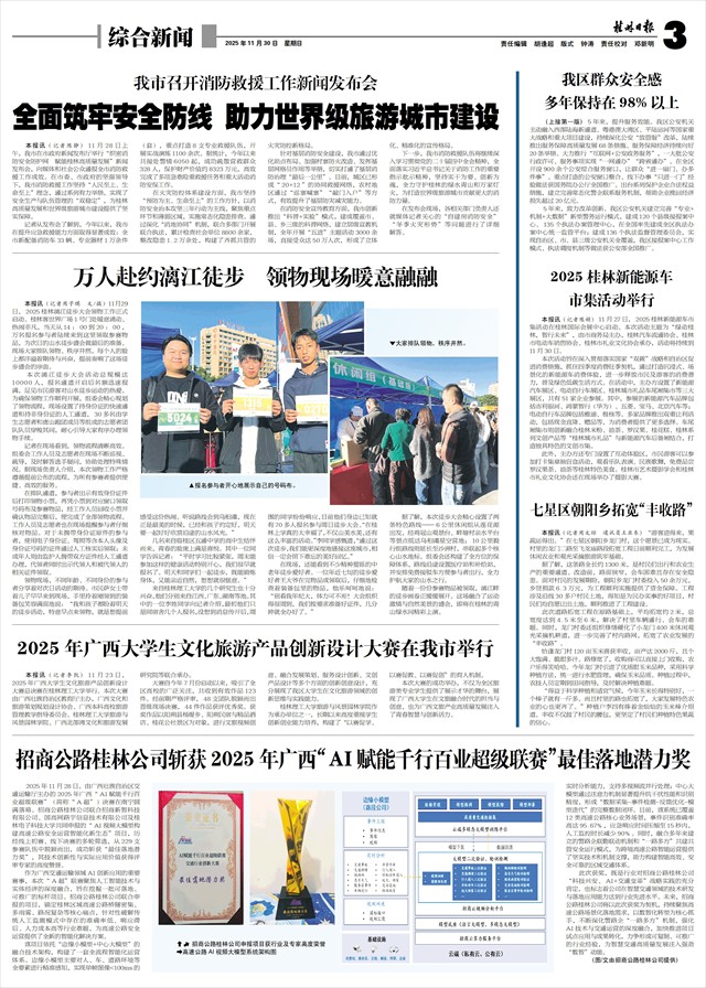 本报讯(记者陈静)11月28日上午,我市在市政府新闻发布厅举行“织密消防安全防护网 赋能桂林高质量发展”新闻发布会,向媒体和社会公众通报全市消防救援工作成效。在市委、市政府的坚强领导下,我市消防救援工作坚持“人民至上、生命至上”理念,通过系列有力举措,实现了安全生产与队伍管理的“双稳定”,为桂林高质量发展和世界级旅游城市建设提供了坚实保障。