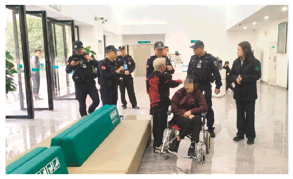 网点员工与民警向迷途老人了解身份信息。 蒋艳萍 摄