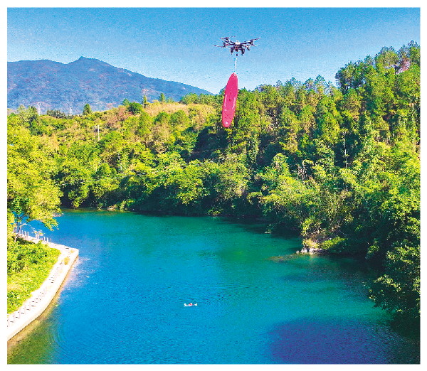 11月28日,临桂区在中庸镇举行森林灭火及水域救援实战演练。灭火无人机、救援无人机和地面救援人员相互配合,开展空地协同救援,有效提高救灾救援效率。图为救援无人机为落水人员抛投救生设备。