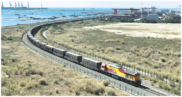 11月29日拍摄的满载集装箱的铁海联运班列(无人机照片)。 新华社记者张爱林 摄