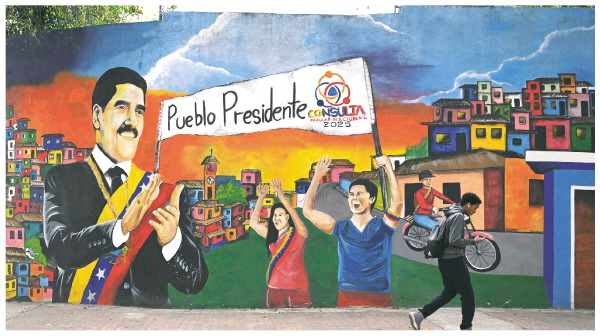 12月2日,在委内瑞拉首都加拉加斯,行人从支持委内瑞拉总统马杜罗的涂鸦墙前走过。