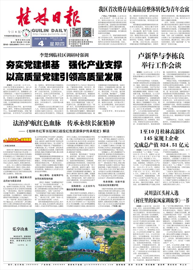 为提升传承效能、强化实施保障,《规定》在传承手段与责任追究上实现双重突破。传承创新方面,第十一条建立红色资源动态名录管理制度,为资源“上户口”,市、县政府按价值确定市、县级名录并公布,新发现资源可申报增补、损毁资源及时调整,2024年桂北六县218处纪念设施专题调研已夯实名录基础。(下转第二版)