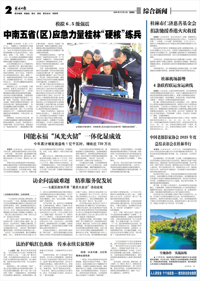 本报讯(记者陈静 文/摄)11月27日,一场模拟6.5级强震的应急演练在桂林市消防救援支队紧张上演。当天,2025年中南协作区地震应急协作联动演练暨工作交流会在此举行,来自湖北、湖南、广东、海南、广西五省(区)53名地震应急救援精锐力量闻令而动,驰援模拟地震震中区,共同锤炼跨区域联合救援的实战能力。