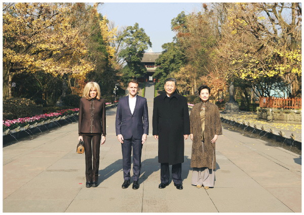 12月5日,国家主席习近平在四川省成都市都江堰同法国总统马克龙进行友好交流。这是习近平和夫人彭丽媛同马克龙夫妇合影。 新华社记者丁海涛 摄