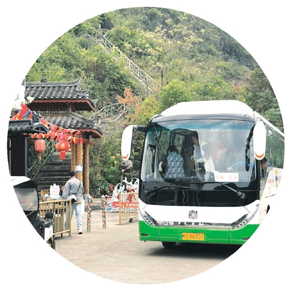 ◥游客乘大巴慕名来沐宦头村观赏玻璃田景观。 记者刘琪 摄