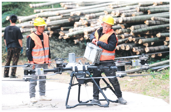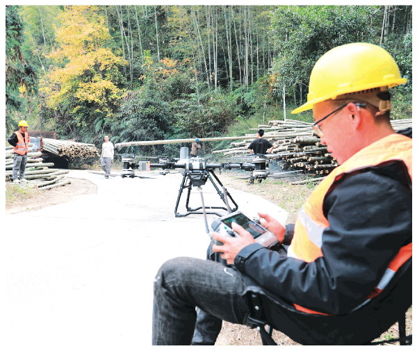 记者日前来到双合村,在蜿蜒的盘山公路旁,看到“飞手”蒋师傅正全神贯注地盯着无人机遥控器屏幕。伴随着螺旋桨强劲的轰鸣,一架四轴无人机稳稳升起,径直飞向山腰。不一会儿,它便吊载着两根10余米长的毛竹折返,沿着预设航线飞越层层密林,不到两分钟,精准降落在路边转运点。等候的工人迅速上前解缆、卸竹,动作干脆利落。随后,无人机再次升空,投入下一趟运输。