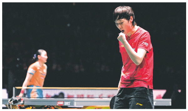 ◥12月7日,中国队选手王曼昱(右)在女单比赛中庆祝得分。她3比0战胜日本队选手张本美和。