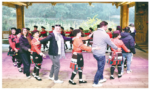 图为在享有“天下第一长发村”美称的黄洛瑶寨,踩线团成员体验民族歌舞,深刻感受红瑶文化的魅力。 记者李凯 摄