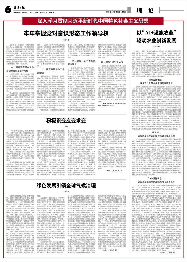 “AI+设施农业”是促进广西农业高质量发展的主抓手,必须在“十五五”中精准发力和系统推进。“十五五”时期,广西农业进入向现代化产业体系深度转型的关键阶段,亟须在生产方式、组织模式和产业形态上实现系统性重塑、结构性优化与动能性提升,全面激活农业高质量发展的内生动力和创新活力。大力发展“人工智能+设施农业”,既深刻把握了党的二十届四中全会关于“全面实施‘人工智能+’行动”和“发展现代设施农业”的核心要义,又精准诠释了广西作为农业大省区在新阶段推动农业现代化的战略担当和路径选择。在战略布局层面,应将“人工智能+设施农业”作为广西智慧农业产业布局的主要方向,确立为广西农业现代化建设的重要任务。培育发展人工智能赋能设施农业技术创新发展的战略科技力量,重点打造设施畜牧业、设施渔业、设施果蔬、设施蚕桑、设施粮油等具有全国影响力的“人工智能+”设施农业产业集群,推动广西成为“人工智能+农业”领域技术、装备、标准、服务向东盟输出的重要枢纽。在技术突破层面,需推进产学研深度融合发展,力争在一些关键环节的核心技术设施上形成先发优势、培育首发经济。重点围绕林果蔬畜糖等特色产业,开发具有地域适应性的大型数据库、智能算法和专用AI模型。结合丘陵山地等地貌特征,开发轻量化、小型化、低成本的山地智能设施装备,促进现代设施农业技术适配、装备实用,不断提升广西农业综合生产能力和质量效益。在场景创新层面,要部署建设作物生长智能监测系统、水肥一体化智能管理系统、病虫害智能识别系统、养殖智能投喂系统、畜禽粪污无害化智能处理系统和智能采摘机器人等智能生产管理场景,布局建设农产品智能化加工示范工厂、数字产销平台和智慧供应链等智慧加工流通场景,加快发展解决山区作业难题的无人机植保、实现品质自动分级的AI分选包装和从生产到餐桌的AI溯源等数字服务创新场景。通过“人工智能+”应用场景建设带动设施农业技术迭代与模式创新,打造一批现代化的植物工厂、数字农田、智慧农场、智慧牧场、智慧渔场,并助力广西在耐盐碱地种植、热区特色种质资源开发、高寒山区反季节果蔬生产、深海渔业智慧养殖等新兴特色领域实现关键突破和产业化发展。唯有以“AI+设施农业”破局,方能推动广西农业现代化迈上新台阶。
