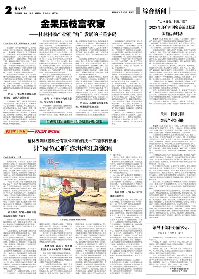 12月的桂林,冬阳温润。在桂林五洲旅游股份有限公司下属企业桂林翼驰船舶科技有限公司的生产车间里,数台被誉为船舶“绿色心脏”的电机直驱型直翼推进器整齐排列。船舶技术工程师石智旭穿行其间,目光扫过每一处细节,时不时停下与同事低声交流几句。这些由他们团队打造的设备即将完成所有厂内流程,预计在今年年底前装配于新建的漓江游船,驶入碧波。