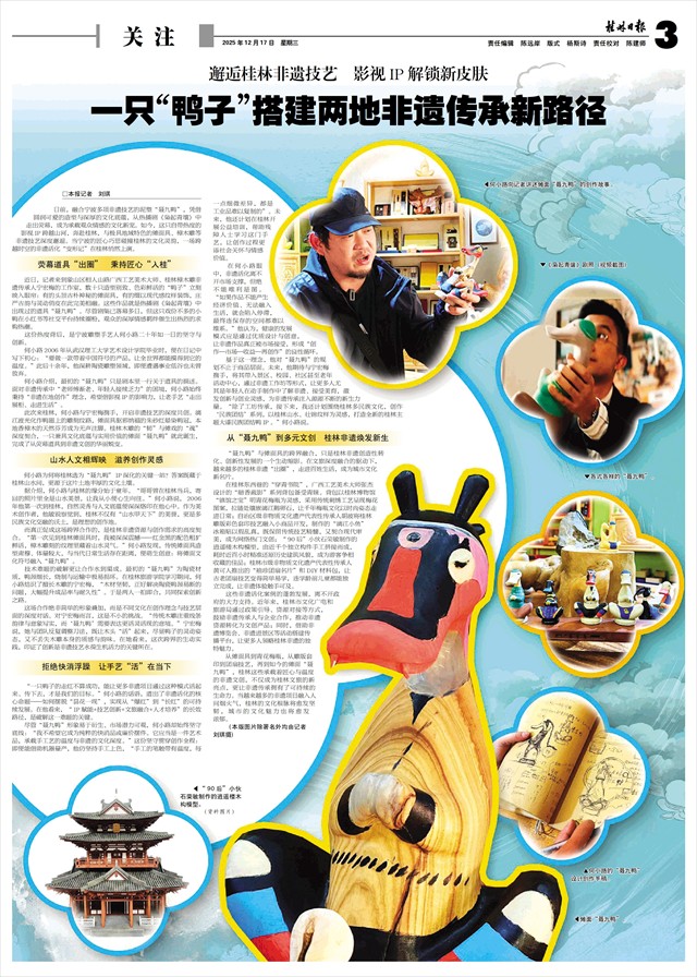 当天,冬游团成员深入象山景区、靖江王城、桂海晴岚、柘漓文化产业园、雁山园等核心景点,聚焦“人、车、路、景”交融画面,展开深度创作。在象山景区里,无人机捕捉水月洞的晨光画卷;靖江王城内,镜头记录千年石刻的历史厚度;桂海晴岚湖面,黑天鹅游弋勾勒冬日诗意;柘漓文化产业园里,非遗匠人手中的漆器散发人文温度;阳朔夜色中,《印象·刘三姐》山水实景演出,将一天的寻美之旅推向高潮。
