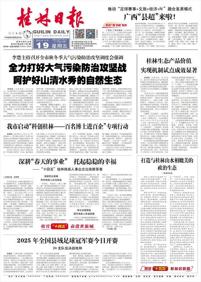 呵护好山清水秀的自然生态   本报讯(记者刘健)12月18日,全市秋冬季大气污染防治攻坚调度会召开,深入学习贯彻党的二十届四中全会精神、习近平生态文明思想、习近平总书记关于广西工作论述的重要要求和对桂林的重要指示精神,贯彻落实党中央、国务院持续深入打好蓝天保卫战决策部署,按照自治区部署要求,分析形势,对防治工作进行再部署、再强化、再推进。市委书记李楚主持会议并讲话。