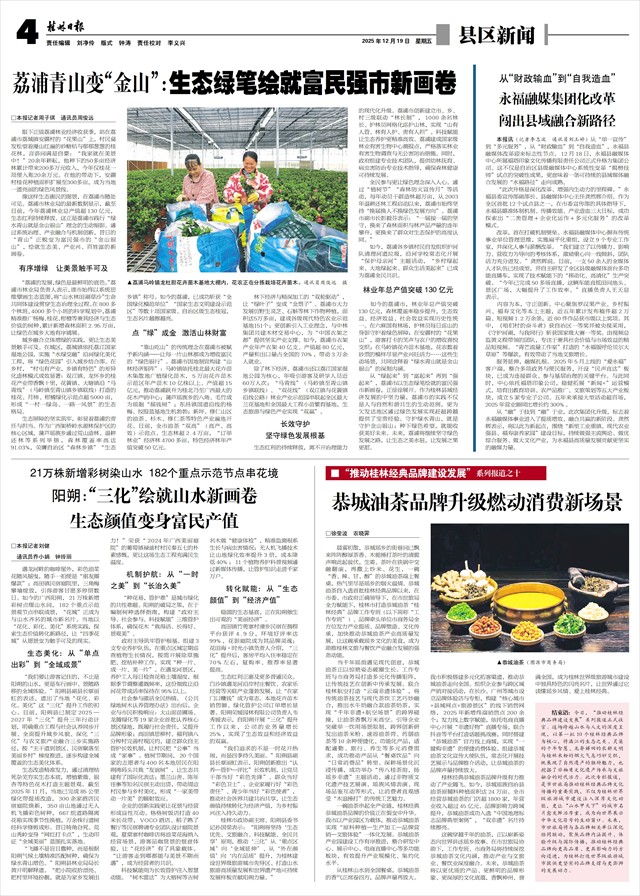 绿色金融的“活水”持续注入。我市在绿色金融领域创下多个“广西第一”:首单绿色金融债、首支绿色资产证券化产品、首支绿色乡村振兴理财产品等相继落地,还发布了全国首个《绿色旅游贷款实施规范》地方绿色金融标准。