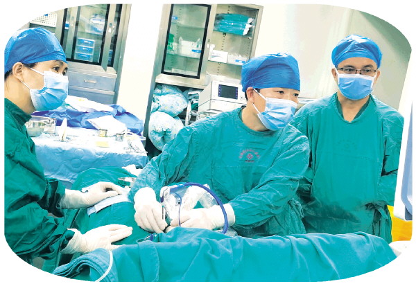 豆天瑾(左二)在为患者做经腹超声引导下子宫腺肌病微波消融术。