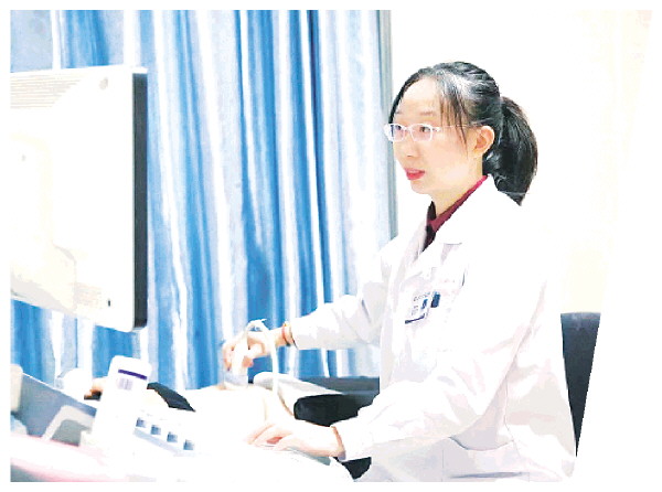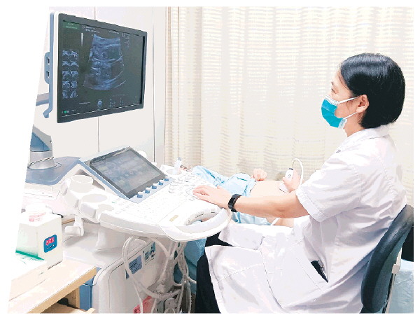 ▲吴贻怡为患者做经腹部超声检查。