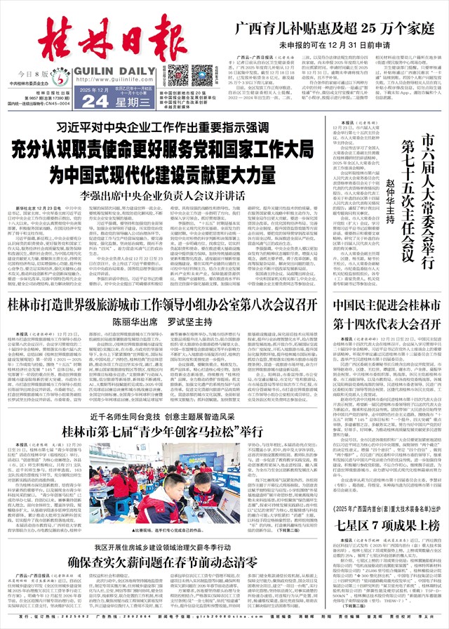 本报讯(记者张婷婷)12月23日,桂林市打造世界级旅游城市工作领导小组办公室第八次会议召开。会议学习贯彻党的二十届四中全会精神,贯彻落实市委六届八次全会精神,总结回顾《桂林世界级旅游城市建设发展规划》第一阶段(2021—2025年)工作成效与经验,围绕“十五五”时期桂林经济社会发展“145”总体目标,研究部署下一阶段的重点任务,推动世界级旅游城市建设取得新的更大突破。市政协主席、市打造世界级旅游城市工作领导小组组长陈丽华出席会议并讲话,市委副书记、市打造世界级旅游城市工作领导小组常务副组长罗试坚主持会议并讲话,市委常委、宣传部部长、市打造世界级旅游城市工作领导小组副组长陆波部署旅游发展综合监管工作。